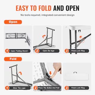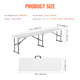 - Asiento cómodo: este banco plegable de 6 pies de 72 x 11 x 17 pulgadas (71.654 x 11.024 x 16.929 in) es altamente portátil y ligero, proporcionando un asiento cómodo sin necesidad de montaje. Simplemente desembala y úsala.