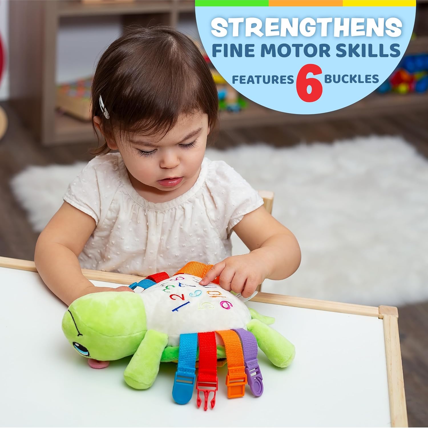 I'm Belle Turtle - The Buckle Toy . I'm loved by every girl and boy. My super soft plush is uniquely designed with colorful primary bold colors to appeal to any child's early fascination with buckles. Toddlers will not only learn to 'SNAP' and "CLICK' but also develop and strengthen fine motor skills, hand eye coordination, problem solving, and color recognition. My cuddly body is decorated with fun shapes and numbers to keep kids learning and entertained. I also have an easy-glide zipper with pocket to hide hidden treasures. I help kids learn and entertain them too. Whether it's counting to improve math skills, naming the shapes, zipping up and down, or snapping buckles there is plenty for kids to learn while on the go. Can't fit me in your luggage bag, suit case or carry on? Strap me on your stroller, diaper bag, shopping cart, car seat, or high chair. My favorite places to play are in the car, train, airplane, grocery store, and doctor waiting rooms. I'm also very popular for improving motor skills for special needs, autistic, and disabled children. I've been PROFESSIONALLY safety tested. And don't worry if I get dirty...I'm surface washable. I'm a great distraction for kids at the dentist; I'm better than a lollipop...and I don't cause cavities. I'm also lightweight and easy to hold for your little learners. Please oh please won't you order me. I'm the best buckle pal there could ever be.