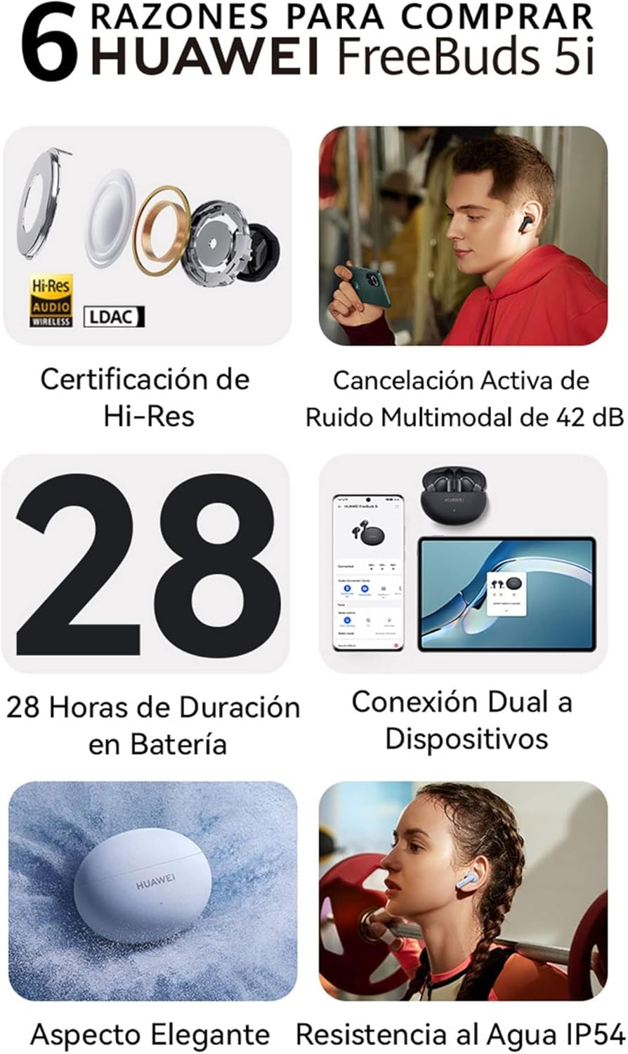 - 【Certificación de Hi-Res】Los HUAWEI FreeBuds 5i cuentan con la certificación Hi-Res Audio Wireless, con una respuesta de frecuencia más amplia, sonido de alta resolución de enlace completo para fuentes de audio de alta definición, y múltiples ecualizadores para adaptarse a una amplia gama de estilos diferentes, para una experiencia auditiva a medida.