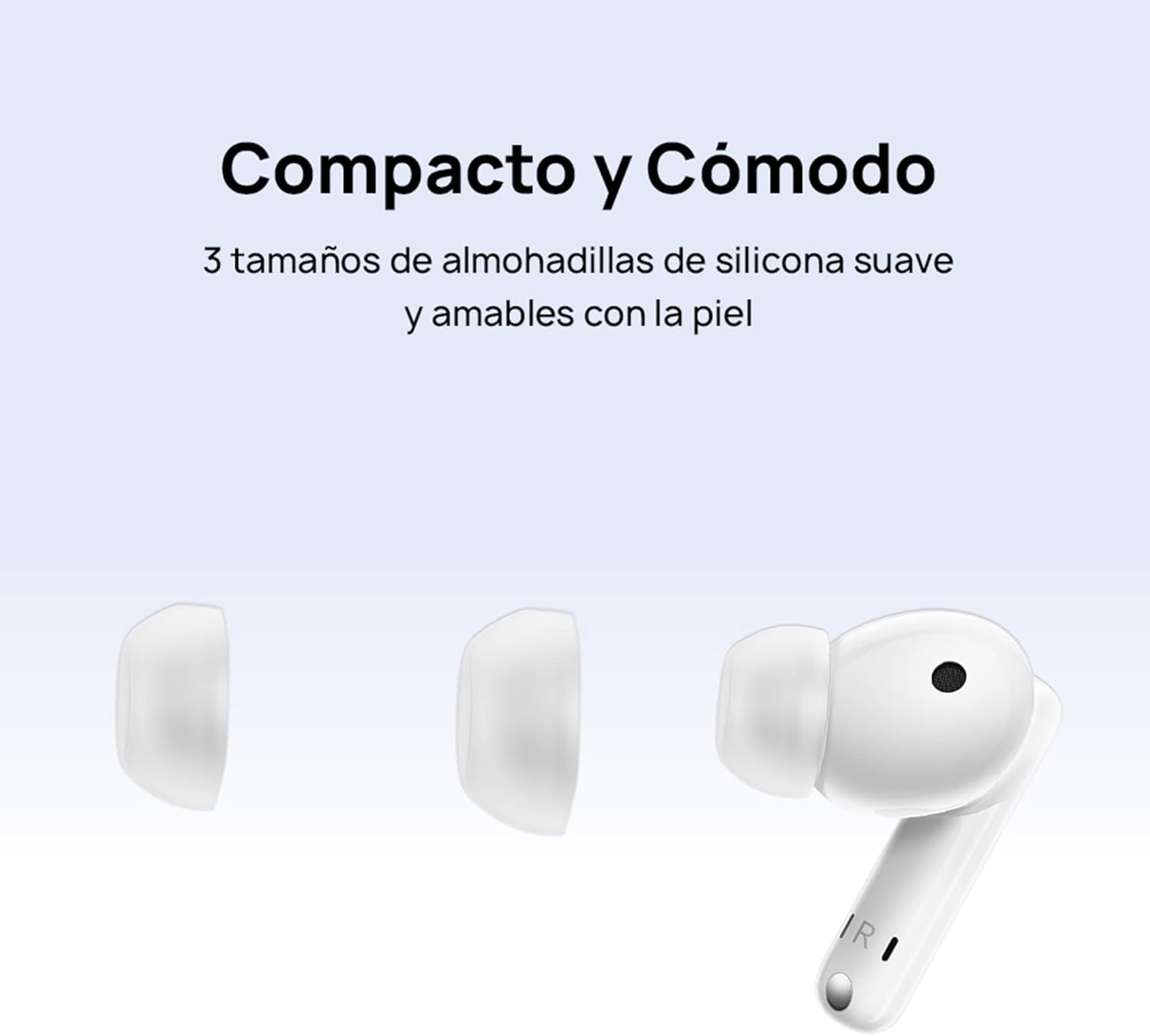 | Componentes incluidos | Almohadillas de silicona (tres tamaños) (Disponibles en tamaño grande, mediano y pequeño. El par de tamaño mediano viene colocado por defecto.), Estuche de carga, Guía de inicio rápido (incluye información de seguridad), Tarjeta de garantía, Audífonos, Cable de carga USB-C |