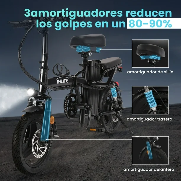 - ¡Transforma tu manera de moverte con la bicicleta eléctrica plegable Inlife C5! Con un potente motor de 400 W, alcanza velocidades de hasta 32 km/h y recorre hasta 40 km con una sola carga gracias a su batería de 48 V y 10 Ah. Disfruta de un viaje suave en cualquier terreno con sus robustos amortiguadores y neumáticos ultra anchos de 14 pulgadas. Elige entre cuatro modos de conducción para personalizar tu experiencia, ya sea en modo eléctrico o asistido. Su diseño plegable la hace fácil de transportar y almacenar. Además, cuenta con una pantalla LCD que te mantiene al tanto de tu estado de batería y velocidad. Confía en la calidad y durabilidad de Inlife y únete a la movilidad ecológica y eficiente. ¡Hazte con tu Inlife C5 y disfruta de cada trayecto!