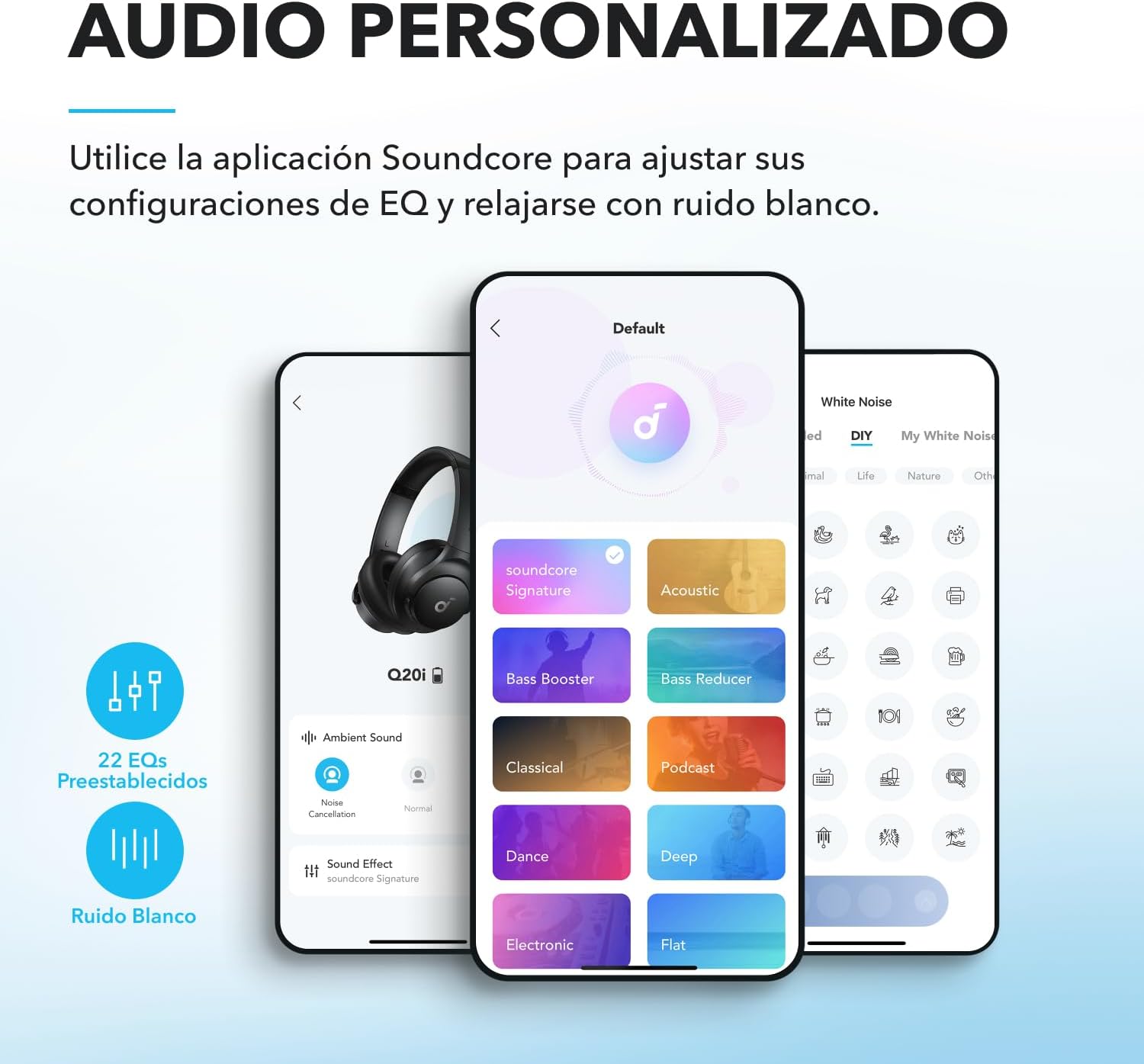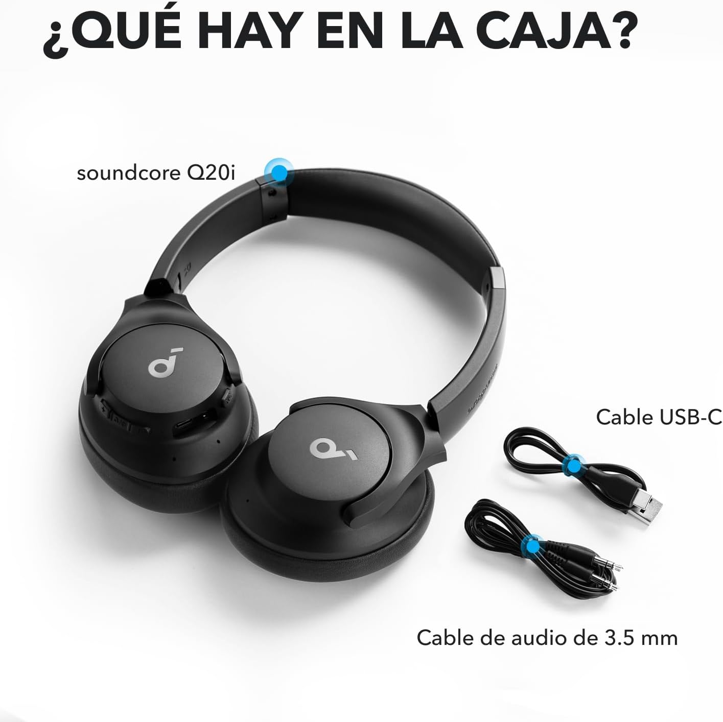 Reducen el ruido hasta en un 90 %: los auriculares con cancelación de ruido soundcore Q20i utilizan tecnología híbrida de cancelación de ruido activa para bloquear de manera efectiva los sonidos en tiempo real.