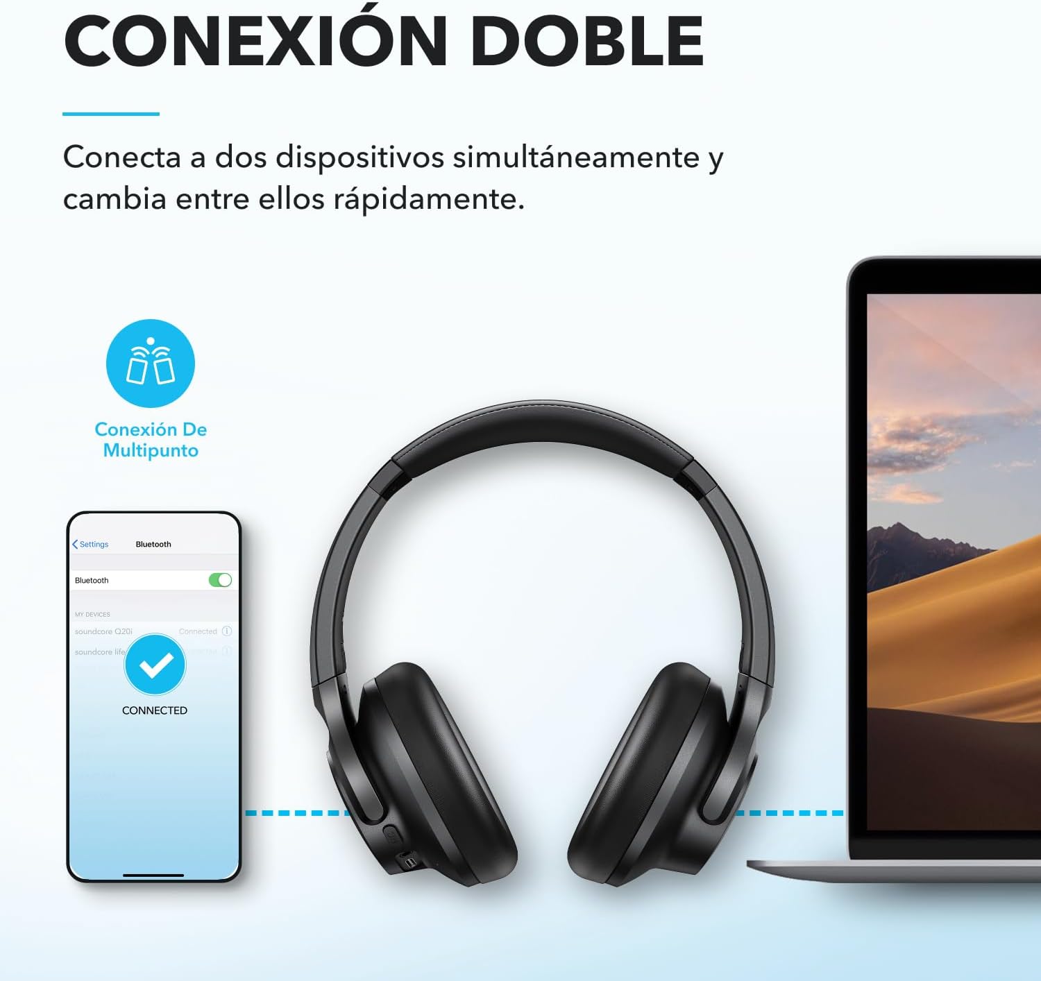 Conexión de dispositivo dual: para mayor comodidad, conecte hasta dos dispositivos al mismo tiempo. Los auriculares con cancelación de ruido cambiarán de forma inteligente al dispositivo que está reproduciendo audio.