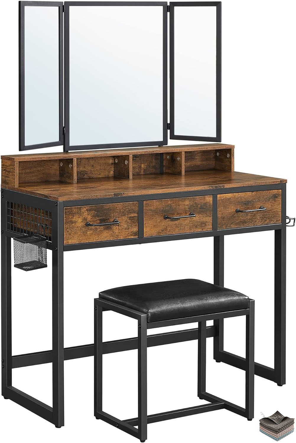 - 【QUÉ HAY EN LA CAJA】 Un elegante tocador con espejo triple, fabricado en aglomerado y acero para mayor estabilidad, y un taburete acolchado